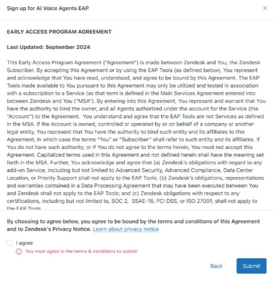 Wenn Sie einen Zendesk Voice-Plan und das Add-on „AI Agents – Advanced“ haben, können Sie sich im Admin Center für das EAP „Voice AI Agents“ registrieren.