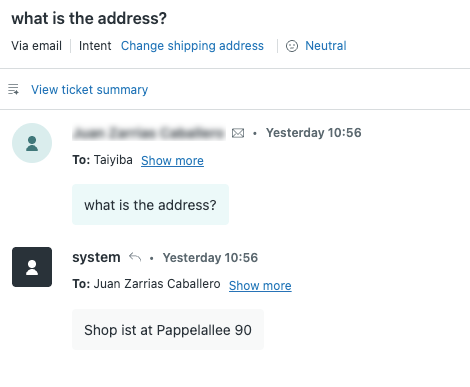 Kunden erhalten weiterhin die E-Mail-Antwort des AI Agent von der im Admin Center ausgewählten Marke und Supportadresse. Im Arbeitsbereich für Agenten hingegen wird im Ticket die Antwort des AI Agent als vom Systembenutzer stammend angezeigt.