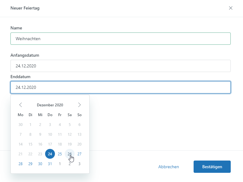 Sie können einen einzelnen Tag (gleiches Anfangs- und Enddatum) oder einen Datumsbereich (unterschiedliches Anfangs- und Enddatum) auswählen. Halbtägige Feiertage sind nicht möglich.