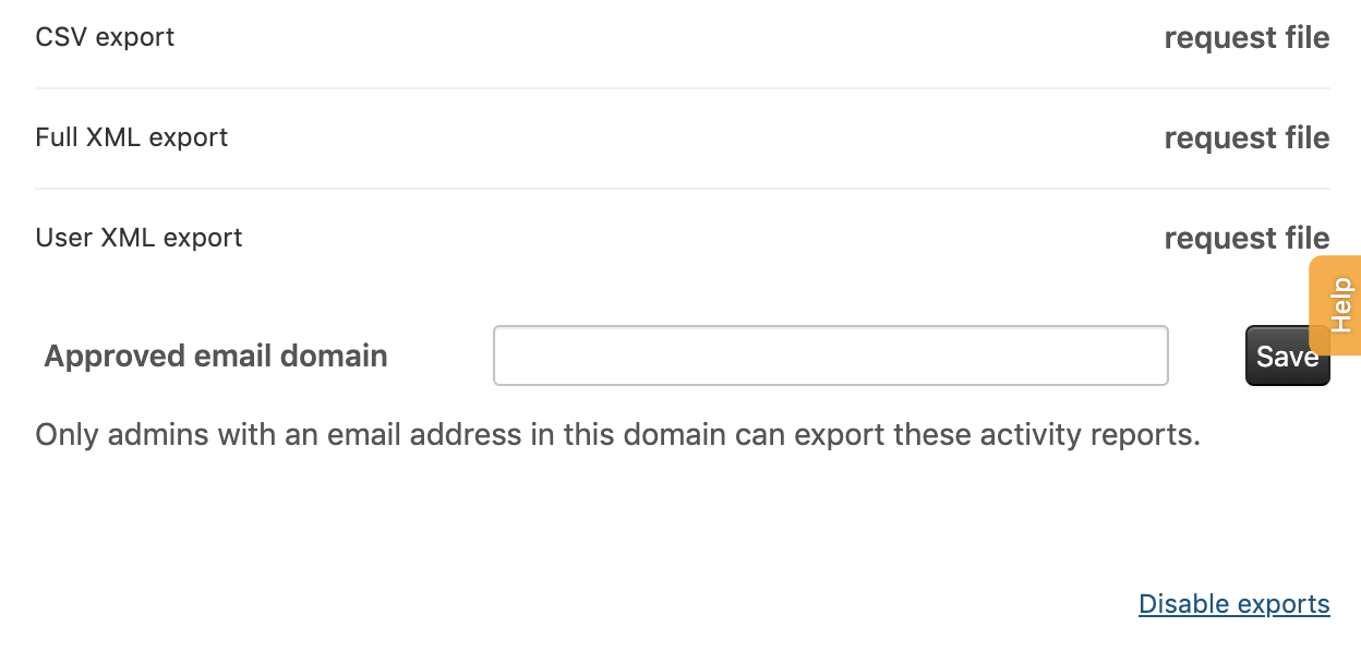 Wenn Sie keinen Wert in diesem Feld angeben, ist der Export von Daten nicht auf Administratoren in einer bestimmten Domäne beschränkt. Stattdessen können alle Administratoren in Ihrer Zendesk Support-Instanz Daten exportieren, unabhängig von ihrer E-Mail-Domäne.