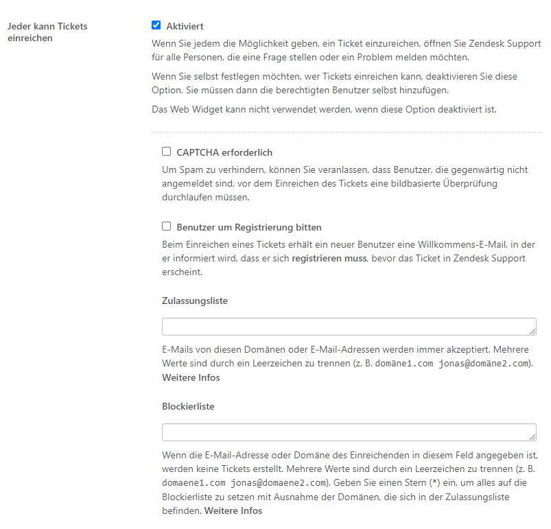 - Wenn alle mit Ausnahme der in der Blacklist aufgeführten Benutzer in der Lage sein sollen, Tickets bei Ihrem Zendesk einzureichen, lassen Sie die Whitelist leer.