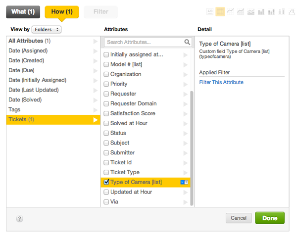 Hinweis: Es empfiehlt sich, diese zwei Attribute zu entfernen, da sie keine für diesen Bericht relevanten Daten enthalten. Der Bindestrich (-) bedeutet, dass im angepassten Feld nichts ausgewählt wurde, und empty value bedeutet, dass das Ticket geschlossen wurde, bevor dieses angepasste Feld erstellt wurde. - Klicken Sie abschließend auf Done.