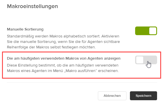 - Deaktivieren Sie auf der Seite mit den Makroeinstellungen die Option Am häufigsten verwendete Makros von Agenten anzeigen.