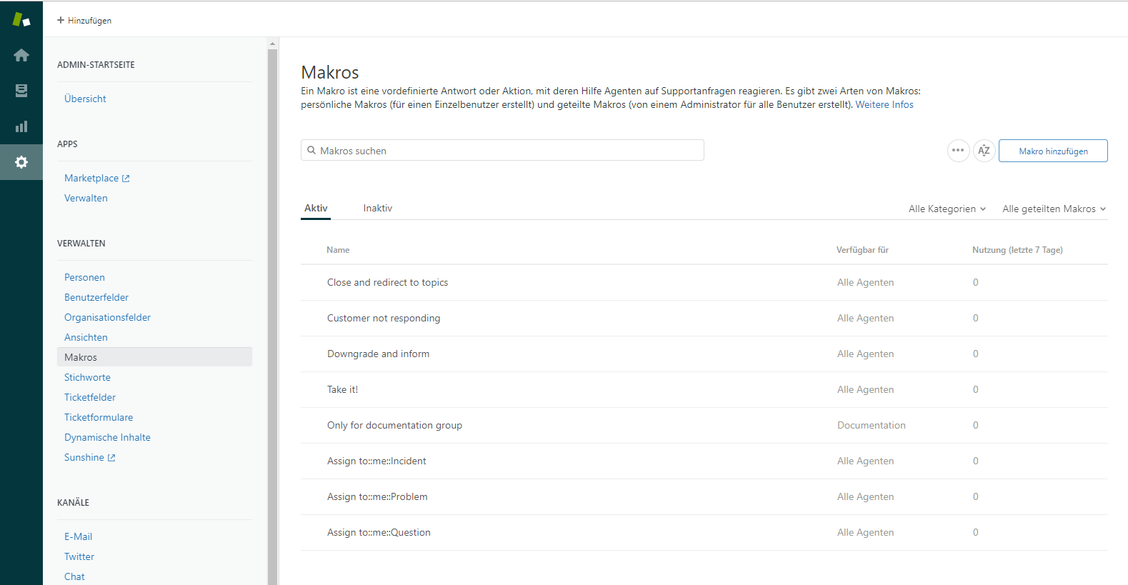 Die meisten Supportteams erstellen und verwenden eine Vielzahl von Makros. Je mehr Makros es gibt, desto schwieriger wird es, schnell das gewünschte Makro zu finden, das auf ein Ticket angewendet werden soll. Um die Arbeit zu erleichtern, können Sie Ihre Makros auf unterschiedliche Weise organisieren und sortieren.