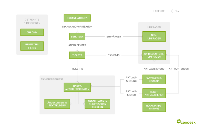 Insights basiert auf einem Datenmodell, das alle Daten darstellt, die von Ihrer Zendesk Support-Instanz für Ihr Insights-Projekt an GoodData gesendet werden. Alle Objekte im Datenmodell repräsentieren Daten, mit denen Sie angepasste Berichte erstellen können.
