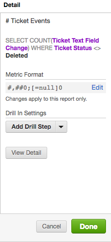 - Drill in Settings: Legen Sie die Attribute fest, die beim Drilldown in die Metrik verwendet werden sollen. Die Drilldown-Einstellungen können auch nach der Erstellung des Berichts hinzugefügt werden.