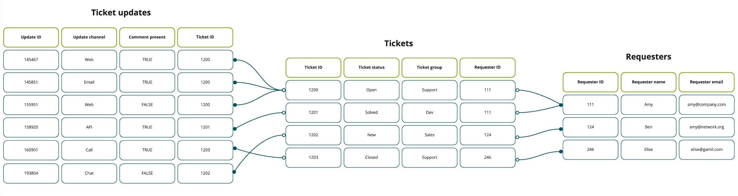 Im folgenden Beispieldiagramm sind die Ticketdaten in der Datentabelle Tickets und die Benutzerdaten in einer separaten Tabelle namens Users gespeichert. Diese Datentabellen sind in den Datasets durch spezielle Attribute miteinander verbunden.