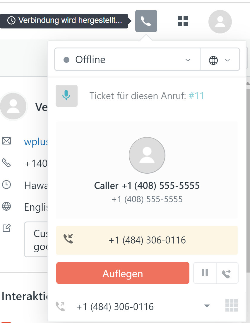 Agenten können Anrufe vom Ticket aus weiterleiten, anhalten oder beenden. |