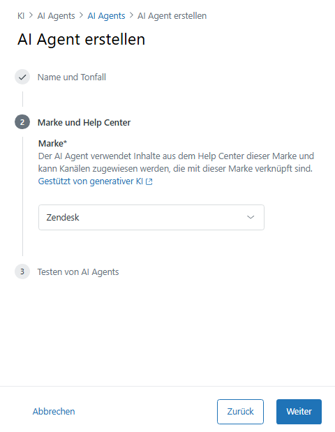 - Wählen Sie in der Dropdownliste Marke die Marke aus, für die Sie den AI Agent verwenden möchten.