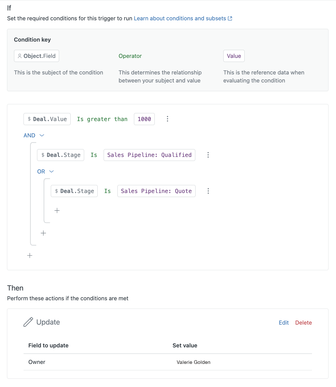 Sie geben an, in welchen Feldern eines Objekts Werte hinzugefügt oder aktualisiert werden sollen. Wenn Sie beispielsweise das Feld Inhaber und den Wert „Valerie Golden“ auswählen, wird der Inhaber des Geschäfts jedes Mal in Valerie Golden geändert, wenn ein Auslöserereignis eintritt und die Bedingungen für diese Aktion erfüllt sind.