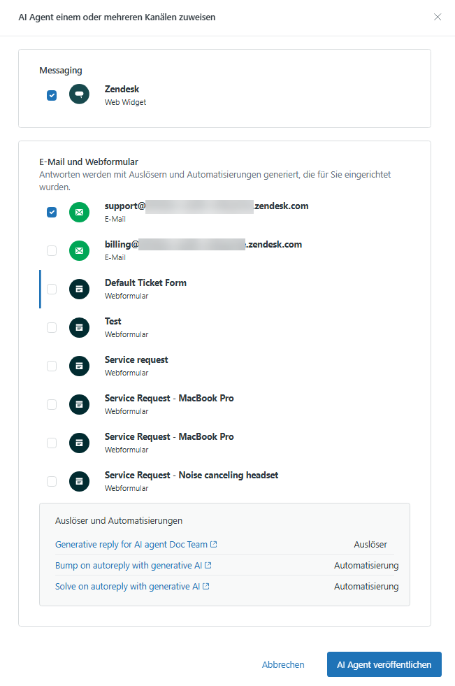 Beim Veröffentlichen eines neuen AI Agent wählen Sie die Kanäle aus, denen er zugeordnet werden soll. Durch die Veröffentlichung wird der neue AI Agent für Kunden in diesen Kanälen bereitgestellt.