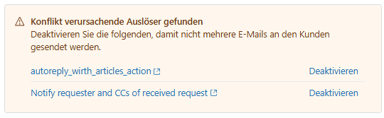 Beim Erstellen des Auslösers prüft das System automatisch, ob mögliche Konflikte mit vorhandenen Auslösern bestehen. Konflikte könnten dazu führen, dass ein Kunde als Antwort auf ein eingereichtes Ticket mehrere E-Mail-Nachrichten erhält. Wenn Konflikte erkannt werden, erhalten Sie eine Warnung mit einem Link zu den betreffenden Auslösern, damit Sie die diese vor dem Veröffentlichen des AI Agent deaktivieren können.