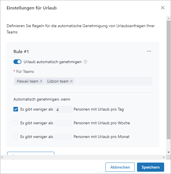 - Klicken Sie im Dialogfeld „Einstellungen für Urlaub“ auf +Regel hinzufügen.