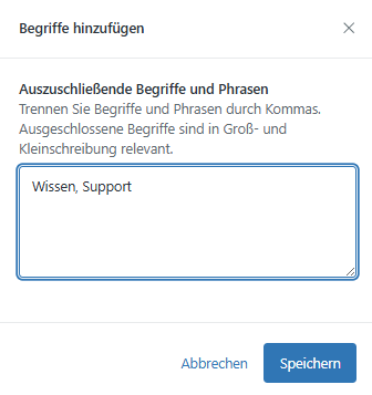 Hinweis: Kommas werden als Trennzeichen zwischen den einzelnen Begriffen behandelt. Wenn Sie eine längere Phrase ausschließen möchten, die selbst Kommas enthält, müssen Sie jedem dieser Kommas einen Rückwärtsschrägstrich (\) voranstellen. Um zum Beispiel die Phrase „Äpfel, Orangen und Bananen“ als Ganzes auszuschließen, müssen Sie sie wie folgt in das Textfeld eingeben: „Äpfel\, Orangen und Bananen“.