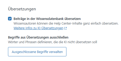 • Ein- und Ausschalten der generativen KI-Funktion zum Übersetzen von Wissensdatenbankbeiträgen