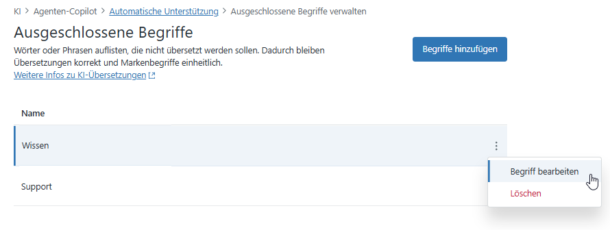 Sie können KI-Übersetzungen so konfigurieren, dass bis zu 300 bestimmte Wörter oder Ausdrücke ausgeschlossen werden. Dadurch wird sichergestellt, dass Begriffe wie Markennamen unübersetzt bleiben und einheitlich verwendet werden. Sie können diese ausgeschlossenen Begriffe nach Bedarf hinzufügen, bearbeiten oder löschen. Diese Funktion hilft dabei, die Genauigkeit und Einheitlichkeit von KI-generierten Übersetzungen zu gewährleisten, da wichtige Begriffe in ihrer ursprünglichen Form beibehalten werden.
