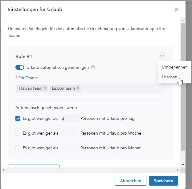 Wenn Sie eine Regel für die automatische Genehmigung von Urlaubsanfragen nicht mehr benötigen, können Sie sie löschen.