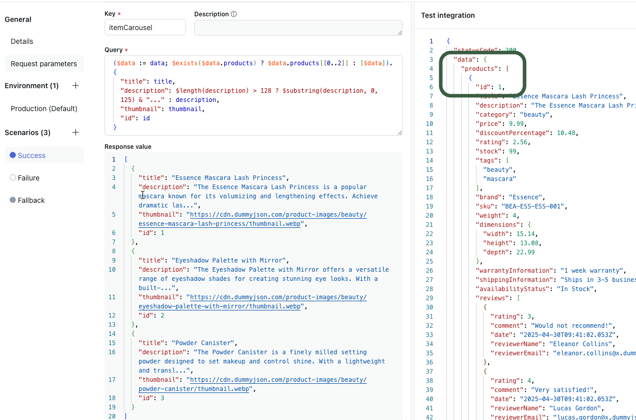 Um dieses Problem zu beheben, aktualisieren Sie die JSONata-Query in der API-Integration, um Antworten ohne Array zu verarbeiten, und geben Sie eine Struktur zurück, die das Karussell verarbeiten kann.