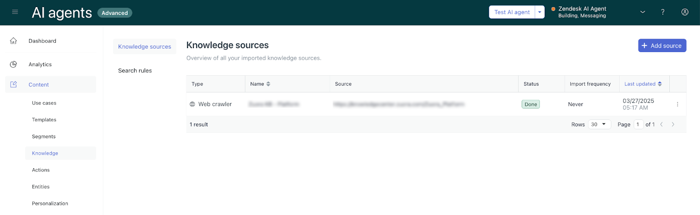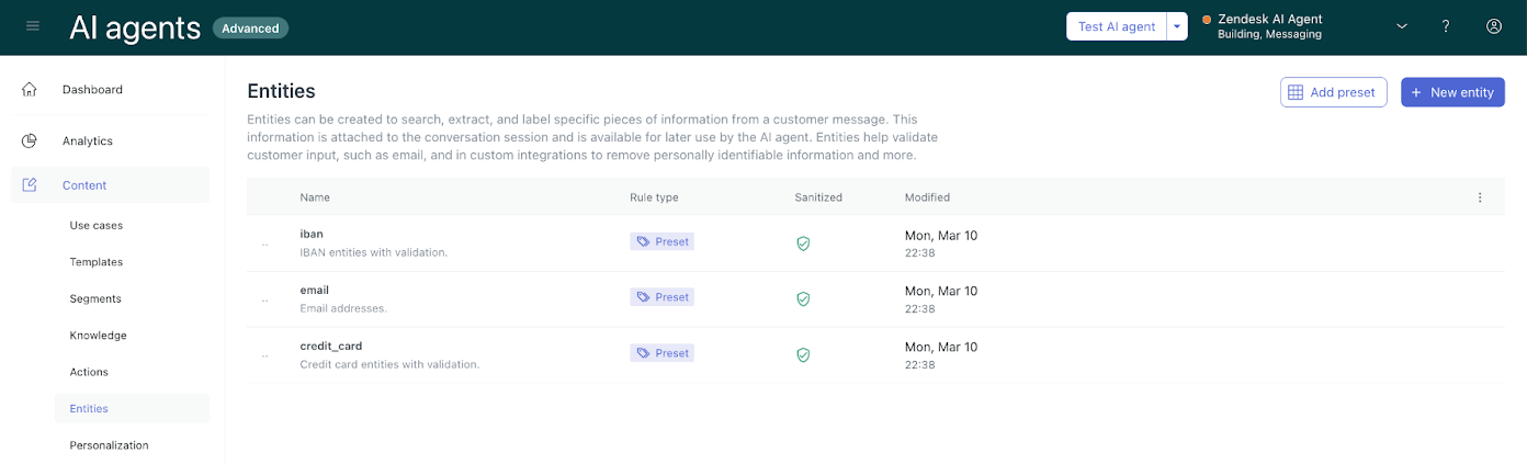 In AI Agents – Advanced werden die Einstellungsseiten für „Generative Antworten“ (einschließlich „Wissen“, „Suchregeln“, „Anleitungen“ und „Persona“) und „Entitäten“ verschoben: