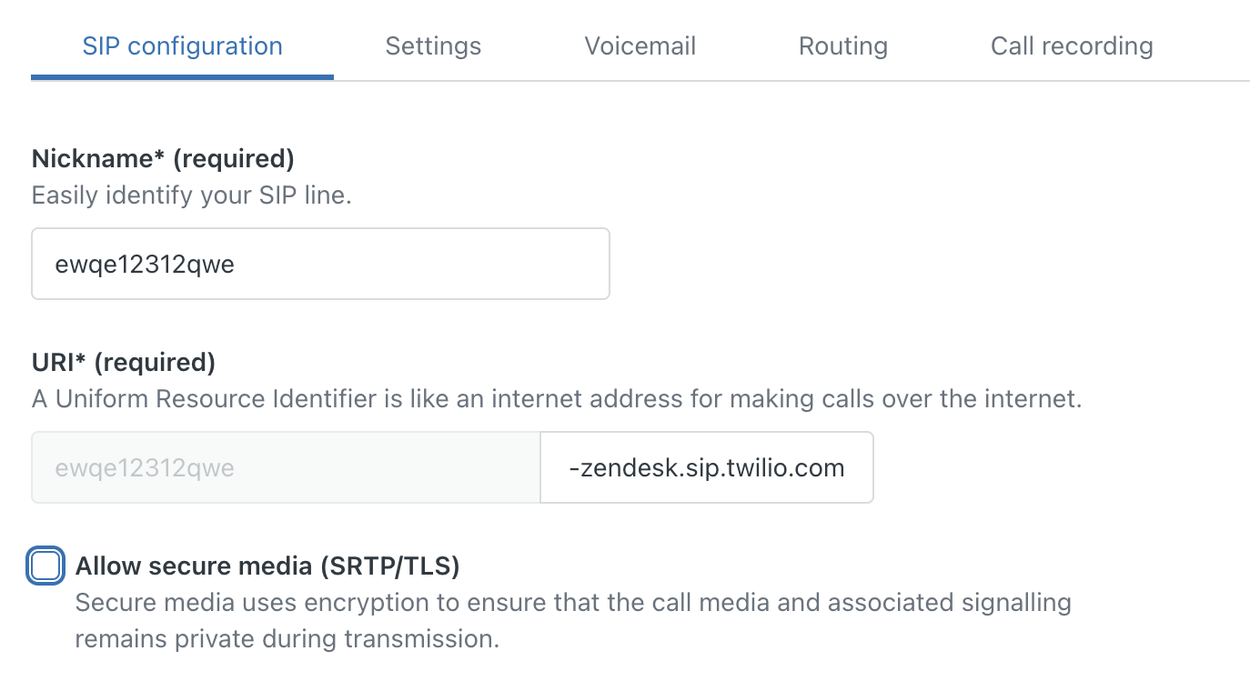 In Admin Center > Channels > Talk > Lines, select your SIP‑IN line, open SIP configuration, turn on the secure media setting on your SIP‑IN line and save. The Zendesk Twilio integration negotiates encryption automatically so no configuration or keys/certificates are required.