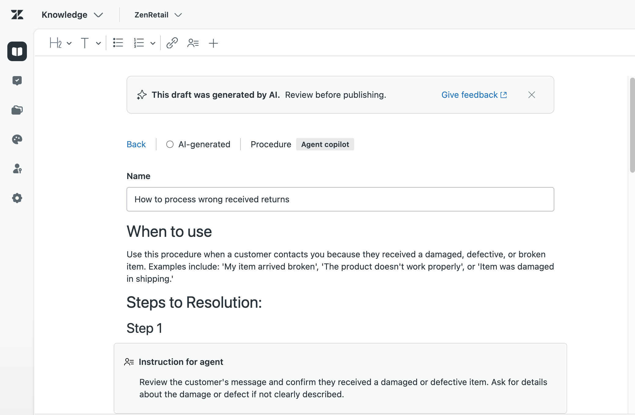 AI-generated procedure drafts must be published by you before they're available for use by auto assist. You can also make any edits to a procedure draft before publishing.