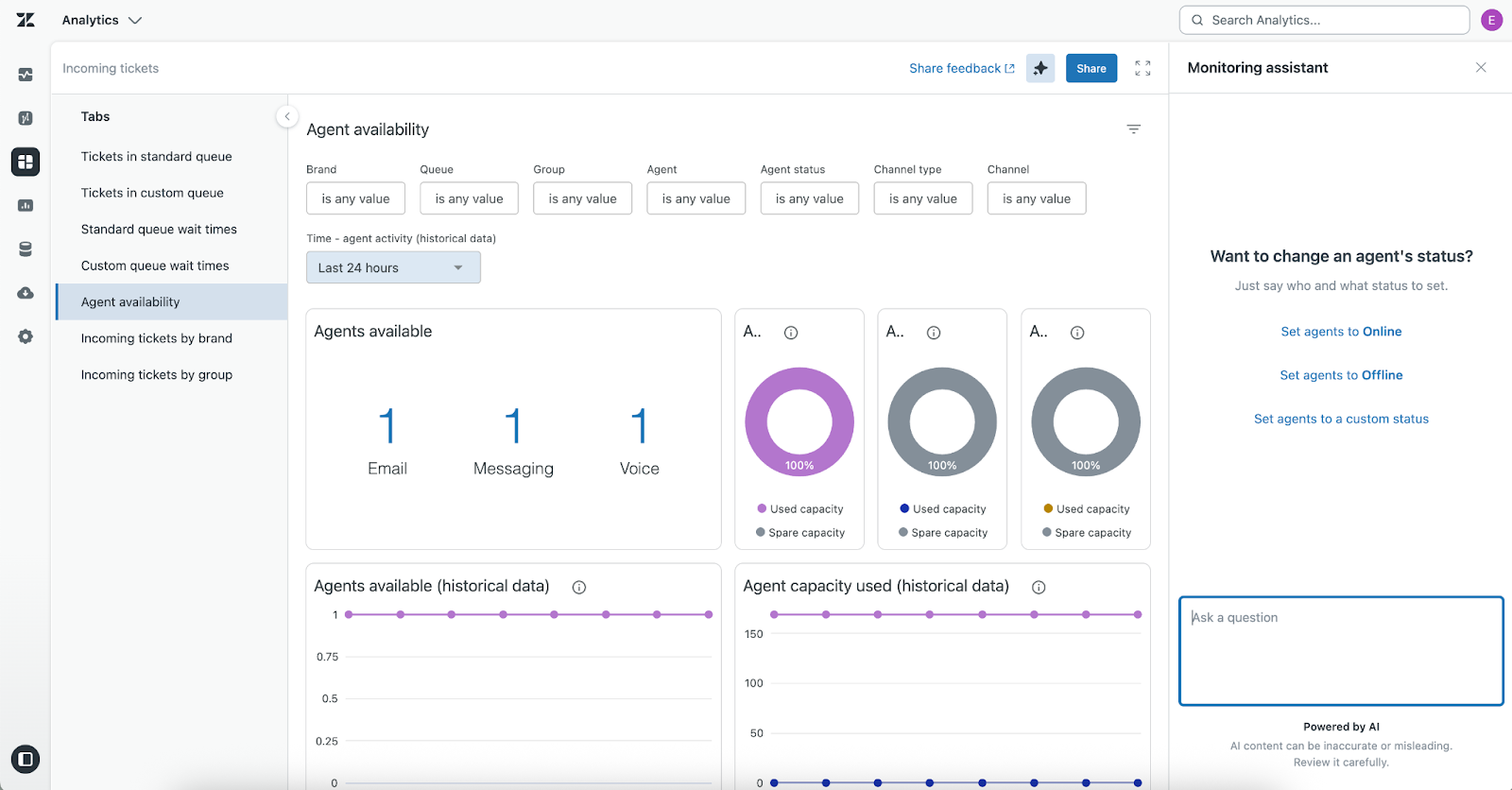 The real time monitoring assistant helps admins update the agent's status from the incoming tickets or agent productivity real time monitoring dashboards using a conversational assistant to reflect that the agent is no longer available and prevent tickets from being routed to them.