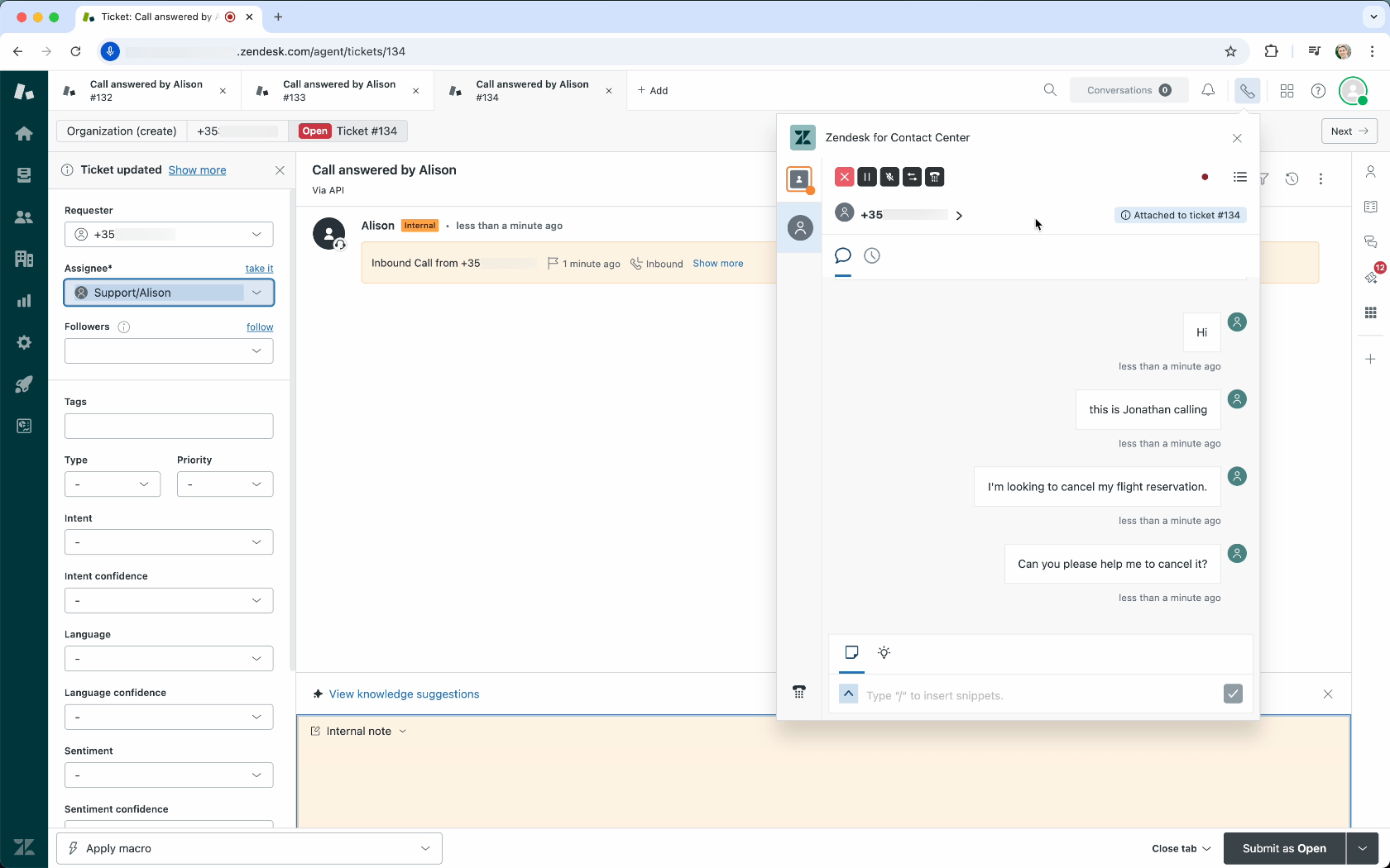 When you turn on live voice transcripts in Contact Center and you have Zendesk Copilot, calls are transcribed into text in real time and agents can request suggestions to advance the ticket while on the call. Generative AI analyzes the live transcript to determine the reason for the customer’s call. Then it automatically searches the help center for relevant articles to help resolve the issue.
