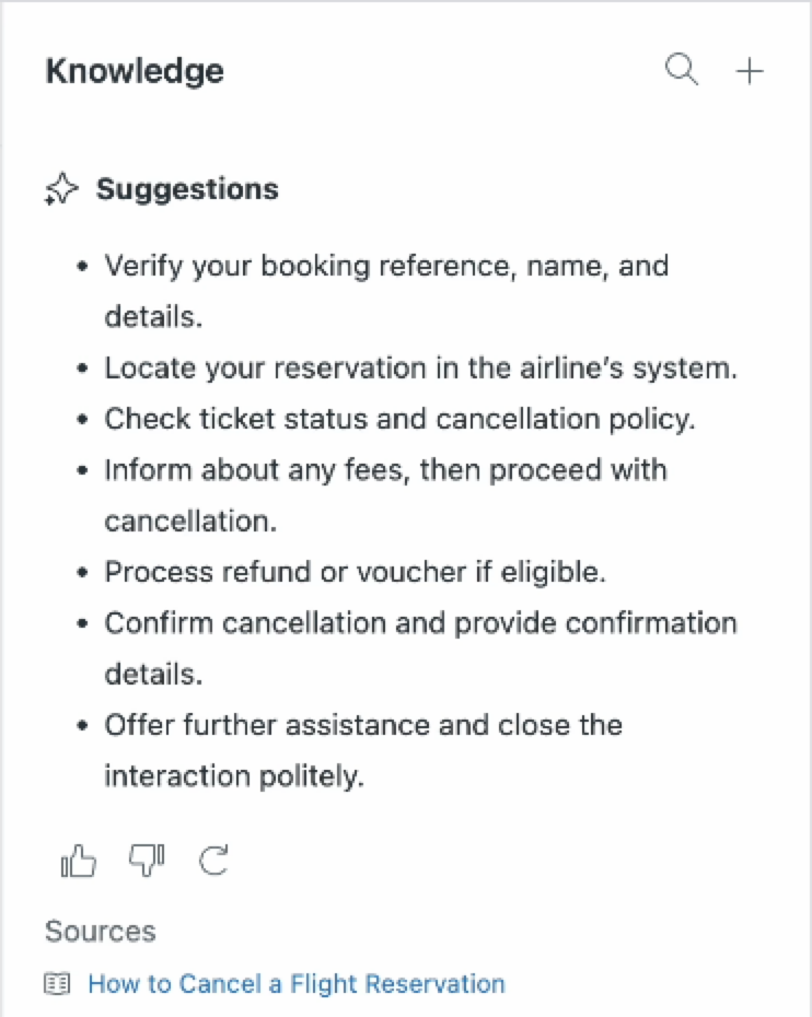 The AI provides a natural language answer, supported by information from one or more articles. When agents request suggestions, these appear in the Knowledge tab in the ticket as digestible, bite-sized pieces of information, helping agents stay focused during the call.