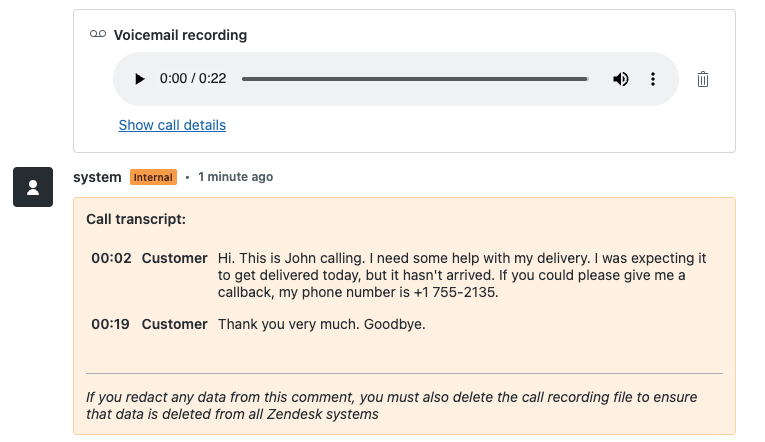 - Faster processing: Voicemail transcriptions will be added to tickets within 15 seconds of the call ending.