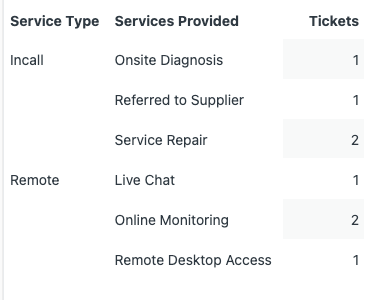 In the example report below, Service Type is the category field, Incall Service and Remote Services are the subcategory fields.