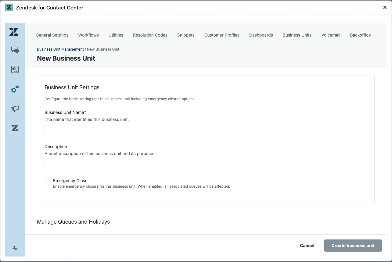 In Contact Center, business units allow you to control contact center availability, emergency closures, and public holidays. They allow you to group queues together and apply closure rules consistently across departments and individual queues without modifying individual contact flows.