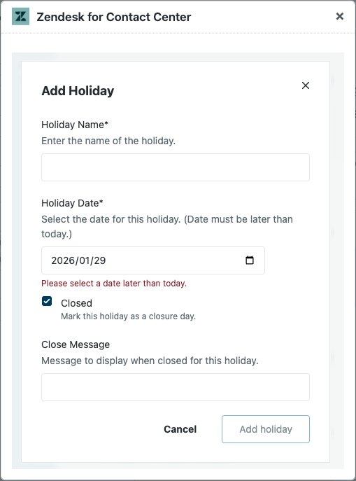 - Under Manage Queues and Holidays, click Add holiday.