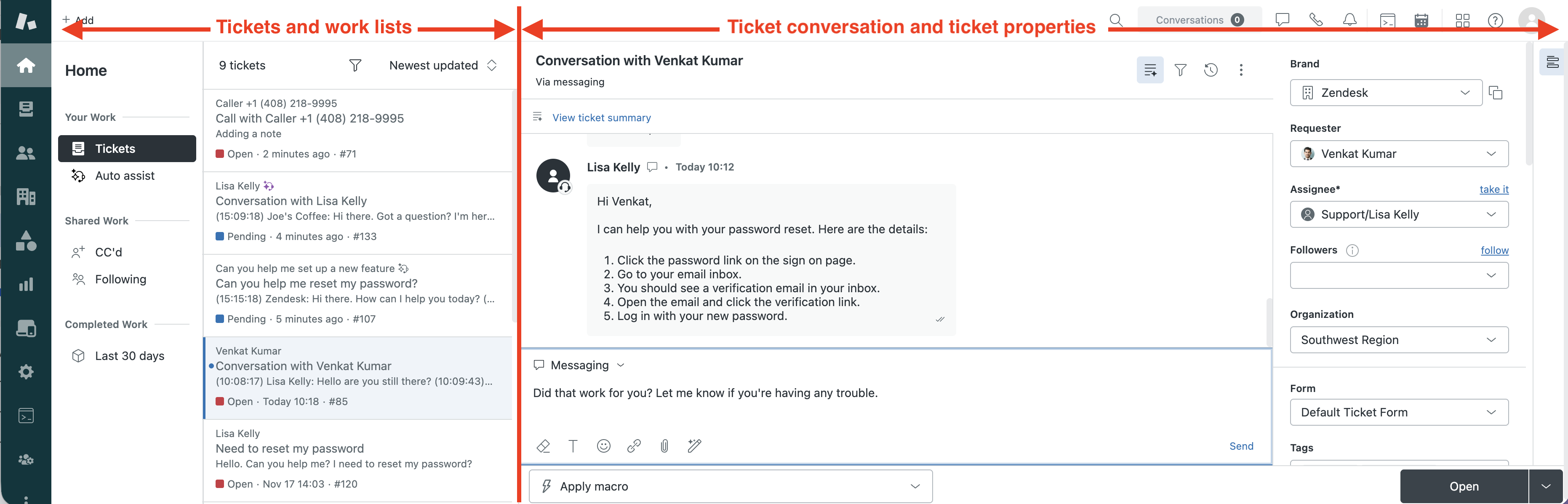 Split view adds an inbox-style layout to Agent Home. When an agent selects a ticket in Agent Home, the page splits into two panels. The work list stays on the left, and the ticket's conversation and composer load in a content area on the right. Agents can browse, triage, and respond to tickets without navigating away from their queue. They can also open the ticket properties panel and make changes to ticket fields.