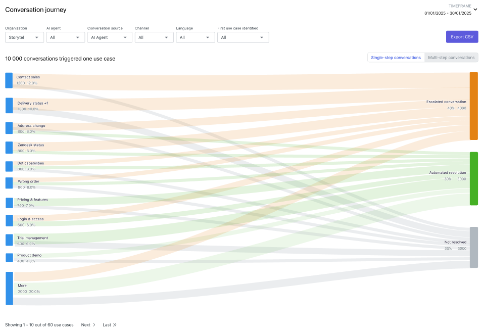 The new Conversation journey tab includes an interactive Sankey diagram that maps the flow of conversations across multiple nodes, where each node represents a use case.