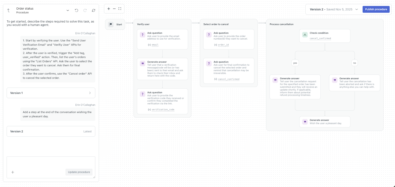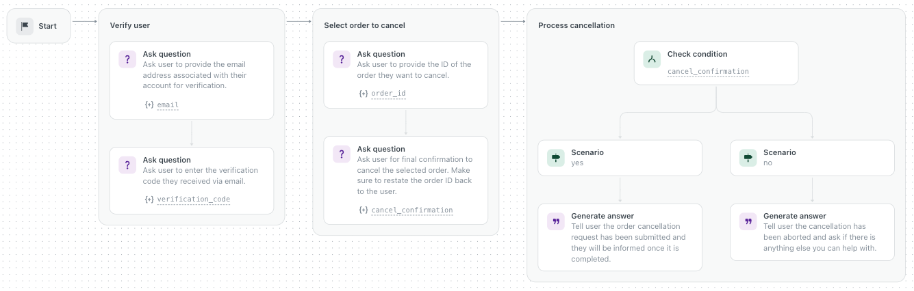 | Ask question | The AI agent asks the customer a question to collect required information, such as an order number or email address. After asking, the procedure waits for the customer’s reply before continuing. If the reply is unclear or incomplete, the AI agent may ask again or ask a clarifying question. |