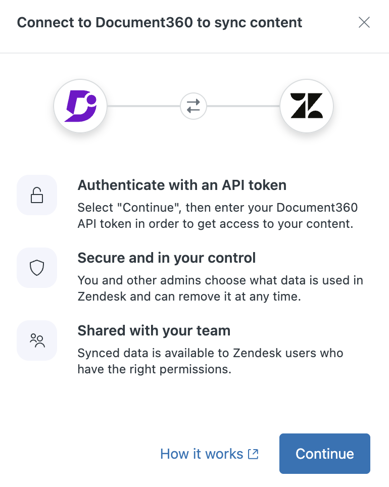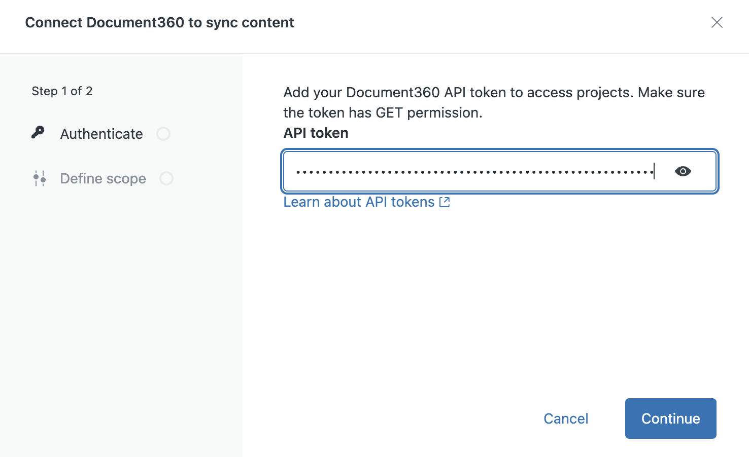 5. Enter the API token that you created in your Document360 account for this connection, then click Continue.