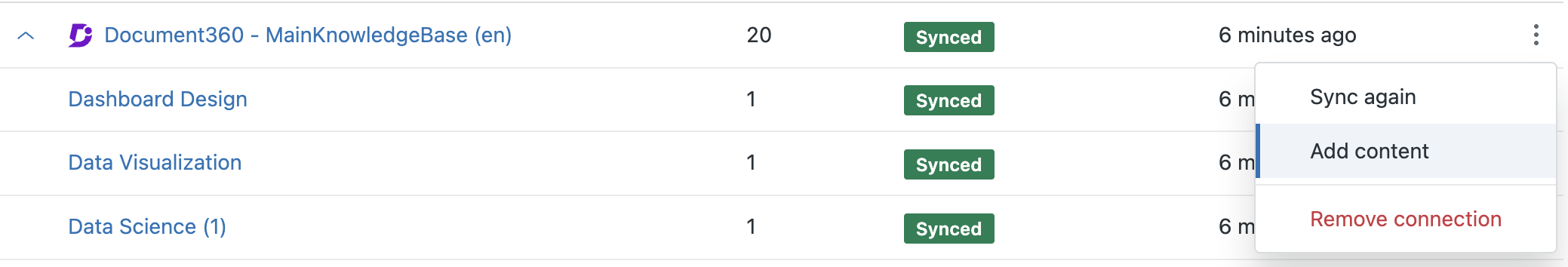 When you connect Document360 as an external content source, a sync process runs every 24 hours to update new or changed content. You can also manually force a sync.