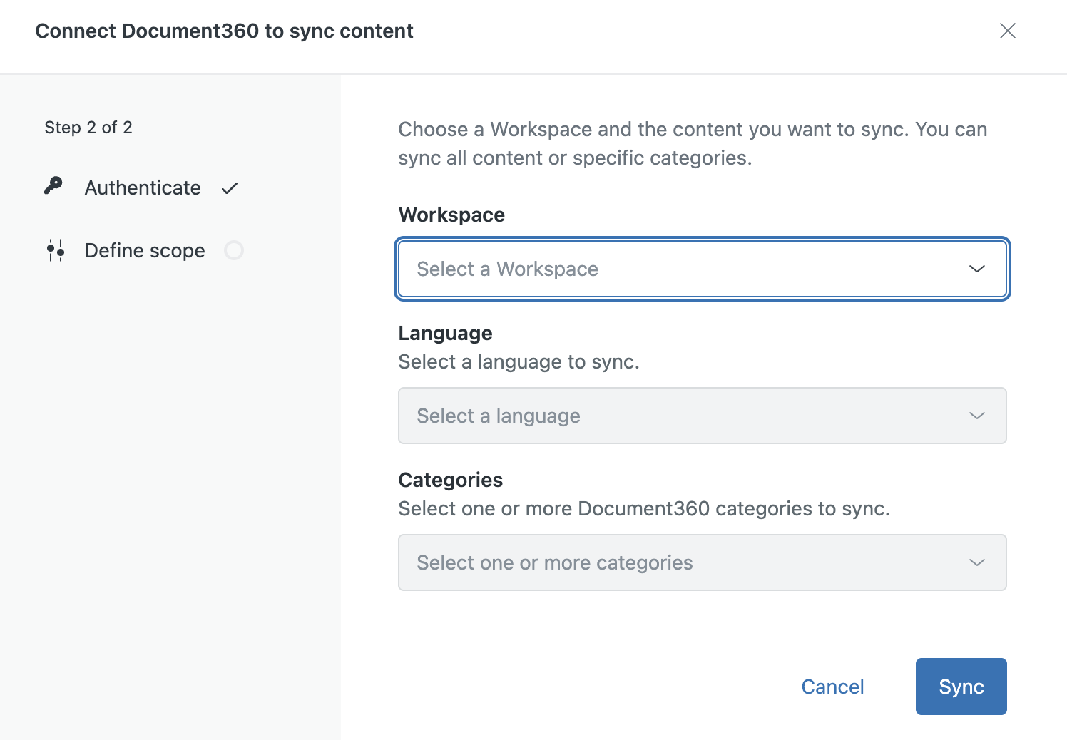 This connection will only sync Document360 content in the language you specify here. You must create a new connection for each language.