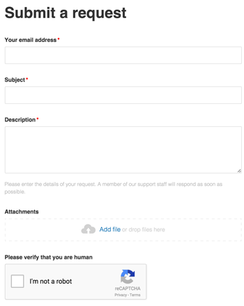 Allowing anybody to submit tickets might lead to some spam email appearing as tickets in your Zendesk. Requiring users who are not registered and signed in to confirm they're human before they can submit a ticket goes a long way to prevent spam. Zendesk uses Google reCAPTCHA. Most users can simply confirm they're human without having to solve a CAPTCHA. A risk analysis engine predicts whether the user is a human or an abusive agent. If the engine isn't sure, it'll display a CAPTCHA that the user must solve before they can submit a ticket.