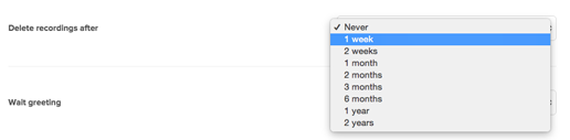 - In the Settings tab, select a timeframe for live call recordings in the Delete recordings after field.
