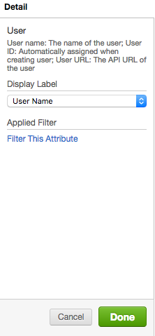 - Display Label: Select how values are represented. For example, for the User attribute, you can select to display either the User Name, ID, or URL. This option is only available for some attributes.