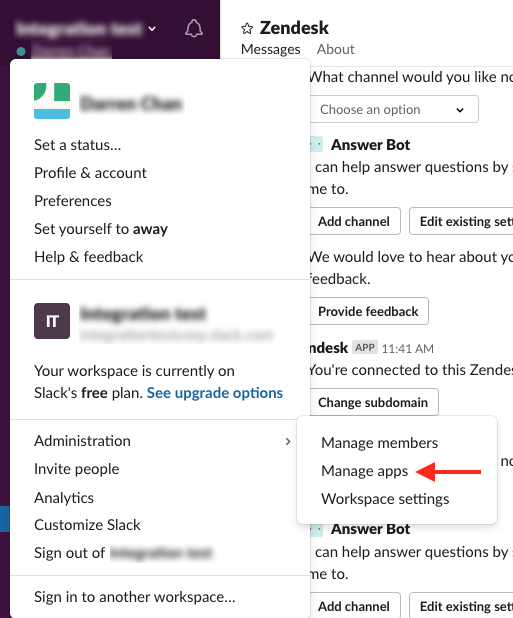 - In Slack, select your workspace drop-down menu and click Administration > Manage apps. The Apps page opens in a web browser.