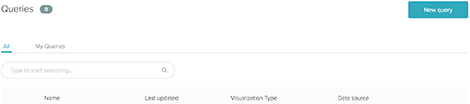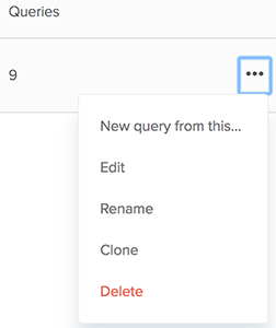 You can create a new query directly from the Queries library. The queries library includes all of your created and cloned reports. You must have added a dataset or duplicated a dashboard to add a query from the queries library (see Working with datasets or Cloning pre-built and shared dashboards).