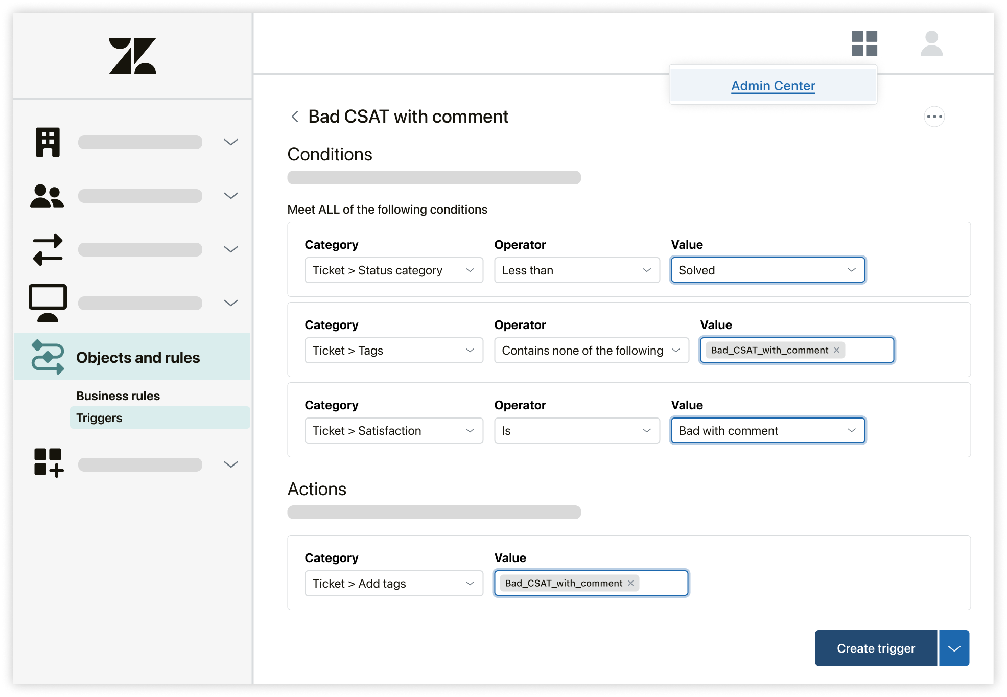 - Under Actions, add Ticket > Add tags | Bad_CSAT_with_comment