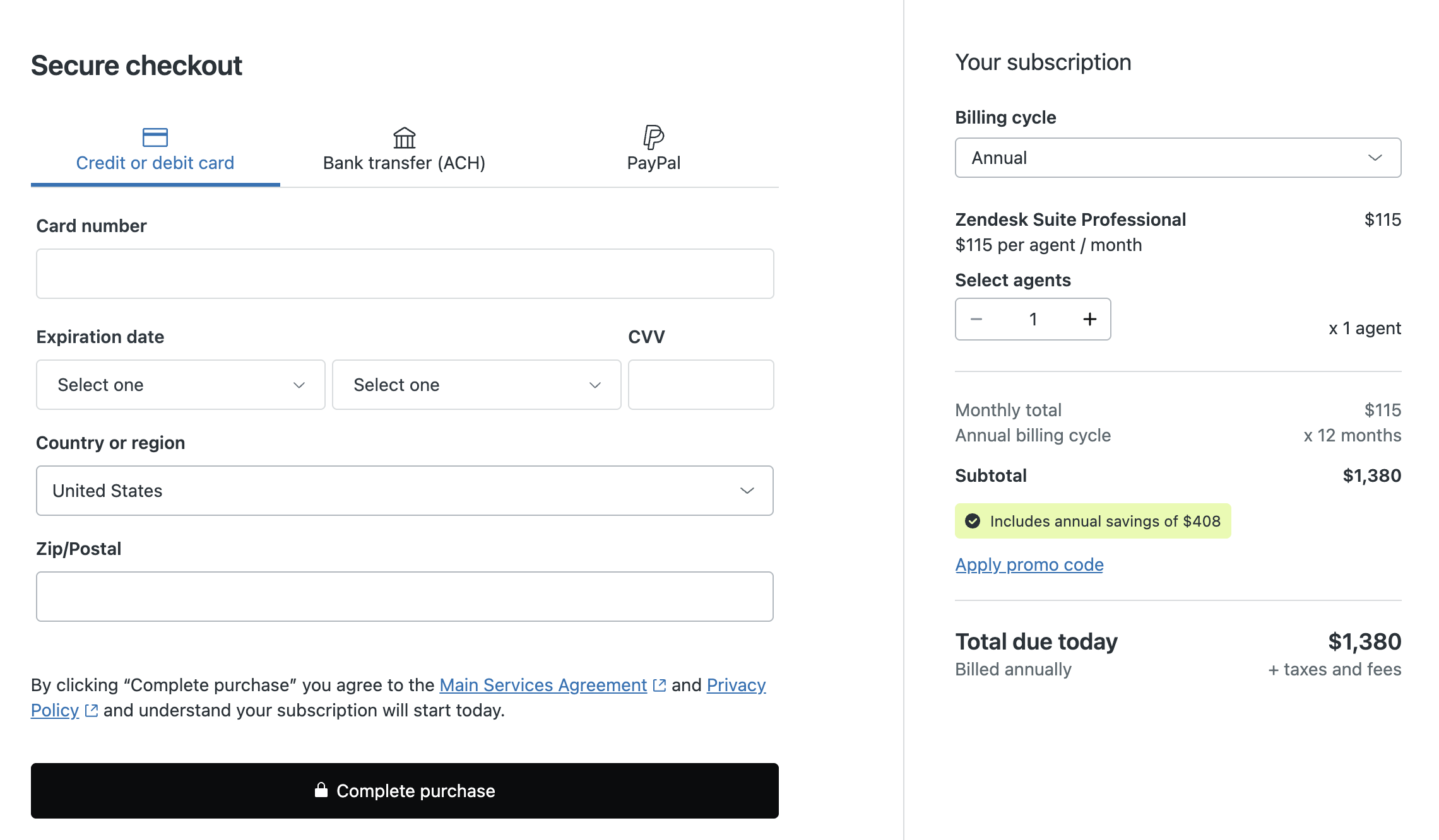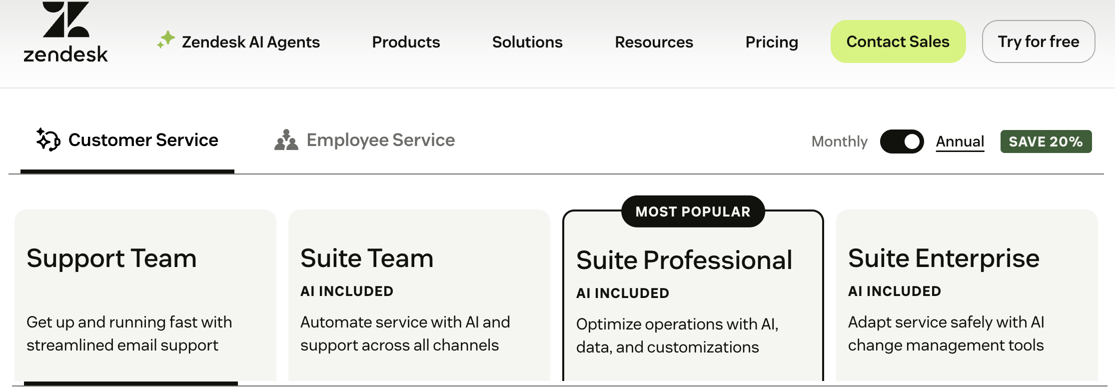 If you are already familiar with Zendesk products and you don’t want to go through a trial, you can buy Zendesk Customer Service Suite directly. The instructions in this section apply to customers who want to purchase Zendesk Customer Service plans. To purchase Zendesk Employee Service Suite plans, start a free trial first before buying or contact Zendesk Sales.