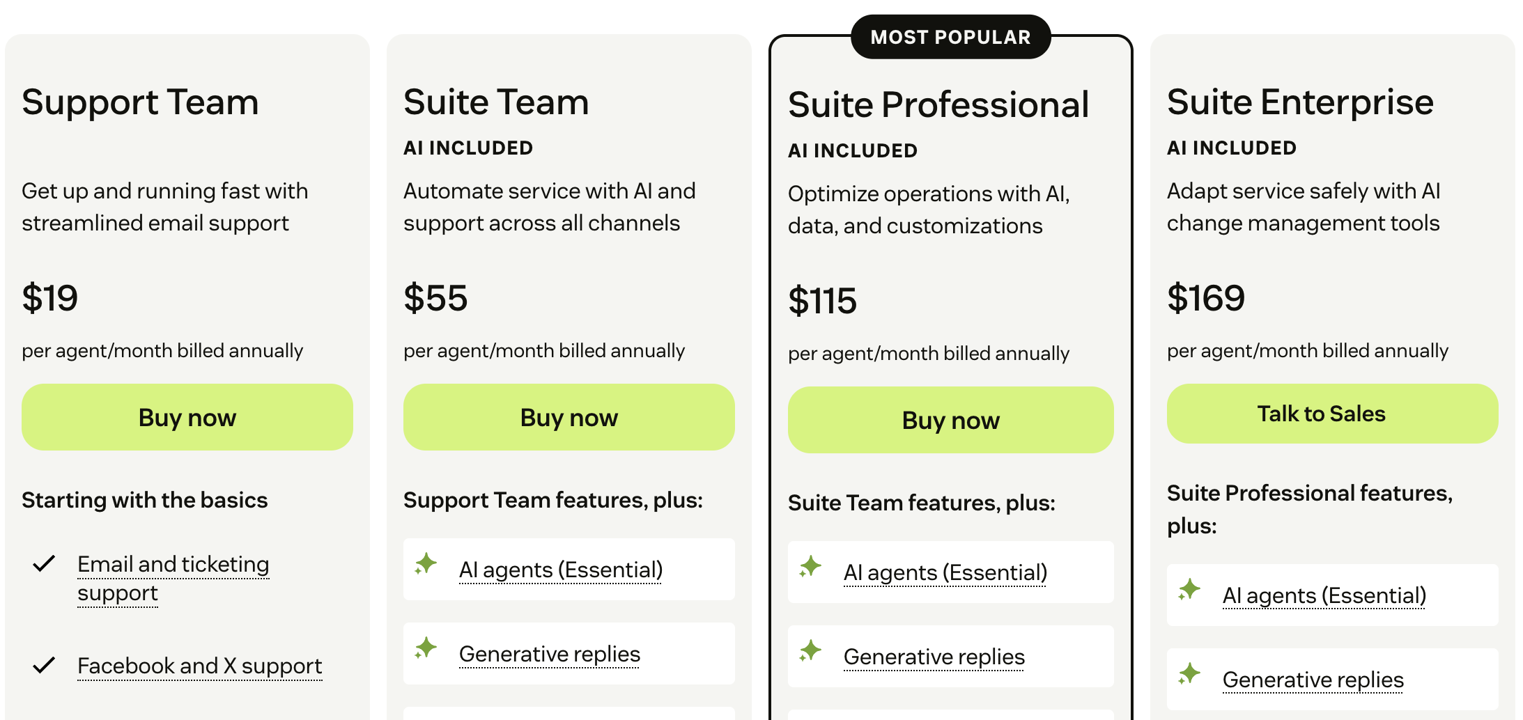There are several versions of Zendesk Suite. Before you decide to buy, Zendesk recommends reviewing these options to see which version best fits your needs. See About Zendesk Suite plans.