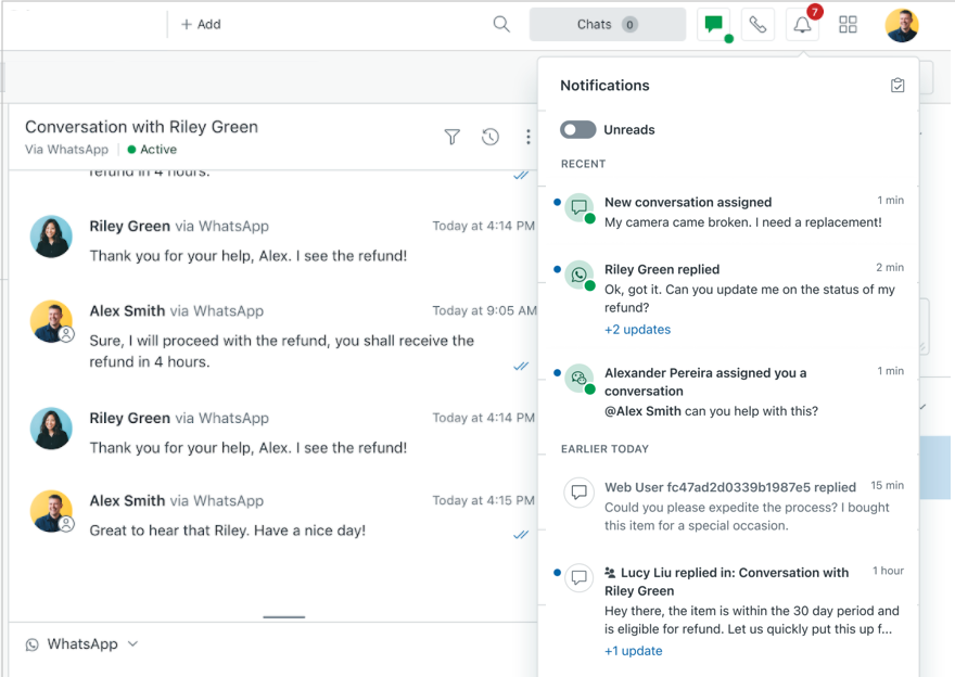 The notifications list is updated whenever a new customer message comes in to one of your messaging tickets, but you don't have the ticket open in the workspace. The list keeps you up-to-date on new conversation assignments, new replies from end users, and @mentions from other agents.