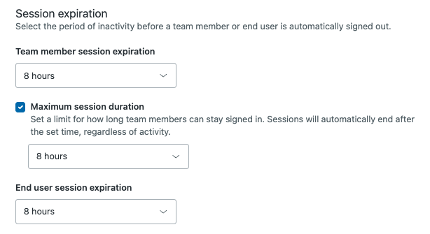 Admins can customize the session expiration period. If your security requirements differ for team members and end users, you can set separate expiration periods for each.