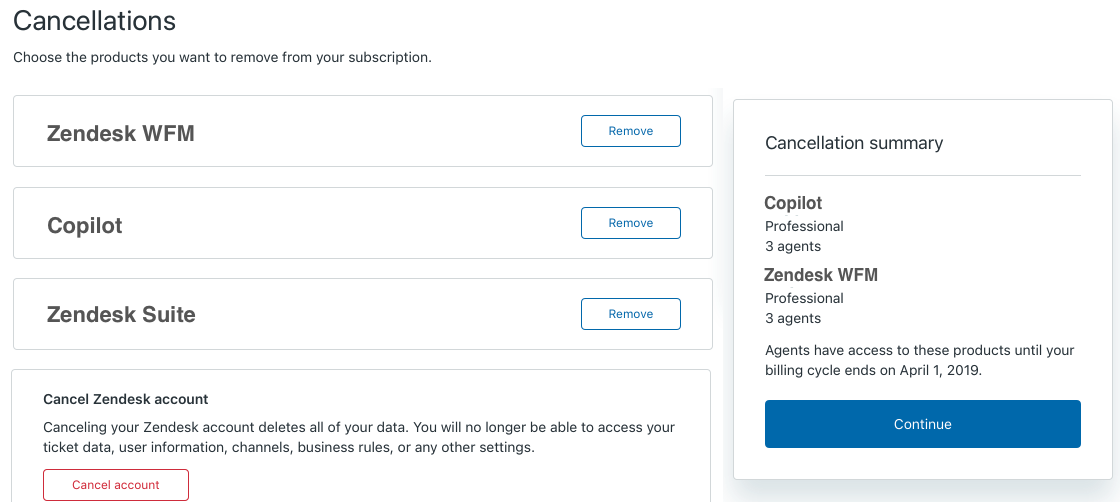 - Unlike other products, removing Support or Zendesk Suite might also cancel your Zendesk account because these products set the foundation for your other products. If this is the case, you will receive a warning message before continuing.
