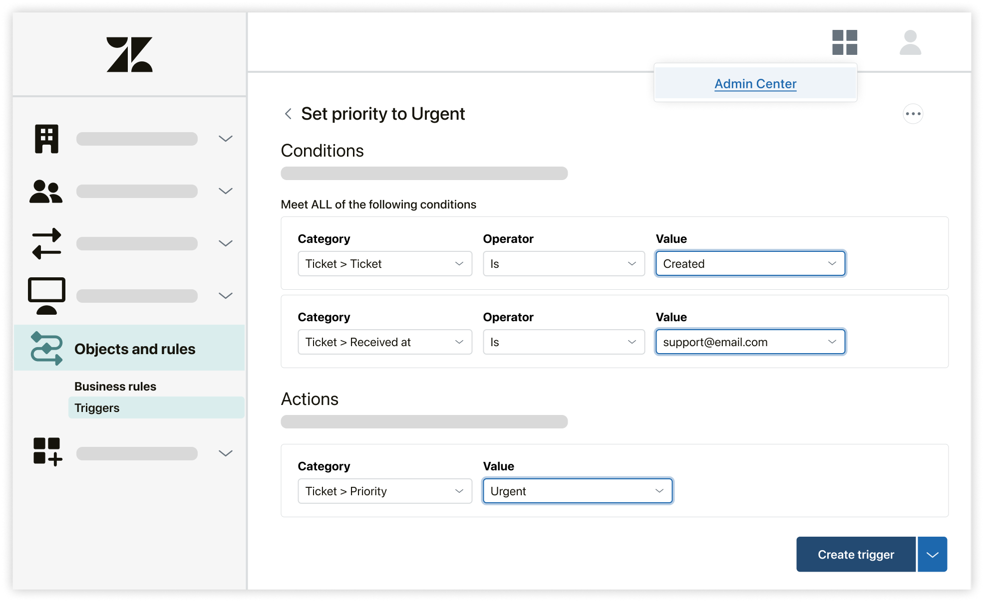 Follow this trigger template to modify other ticket properties based on the support address. For example, to tag all tickets received at one support address, modify the actions to add a tag instead. Mix and match trigger conditions based on your workflow.